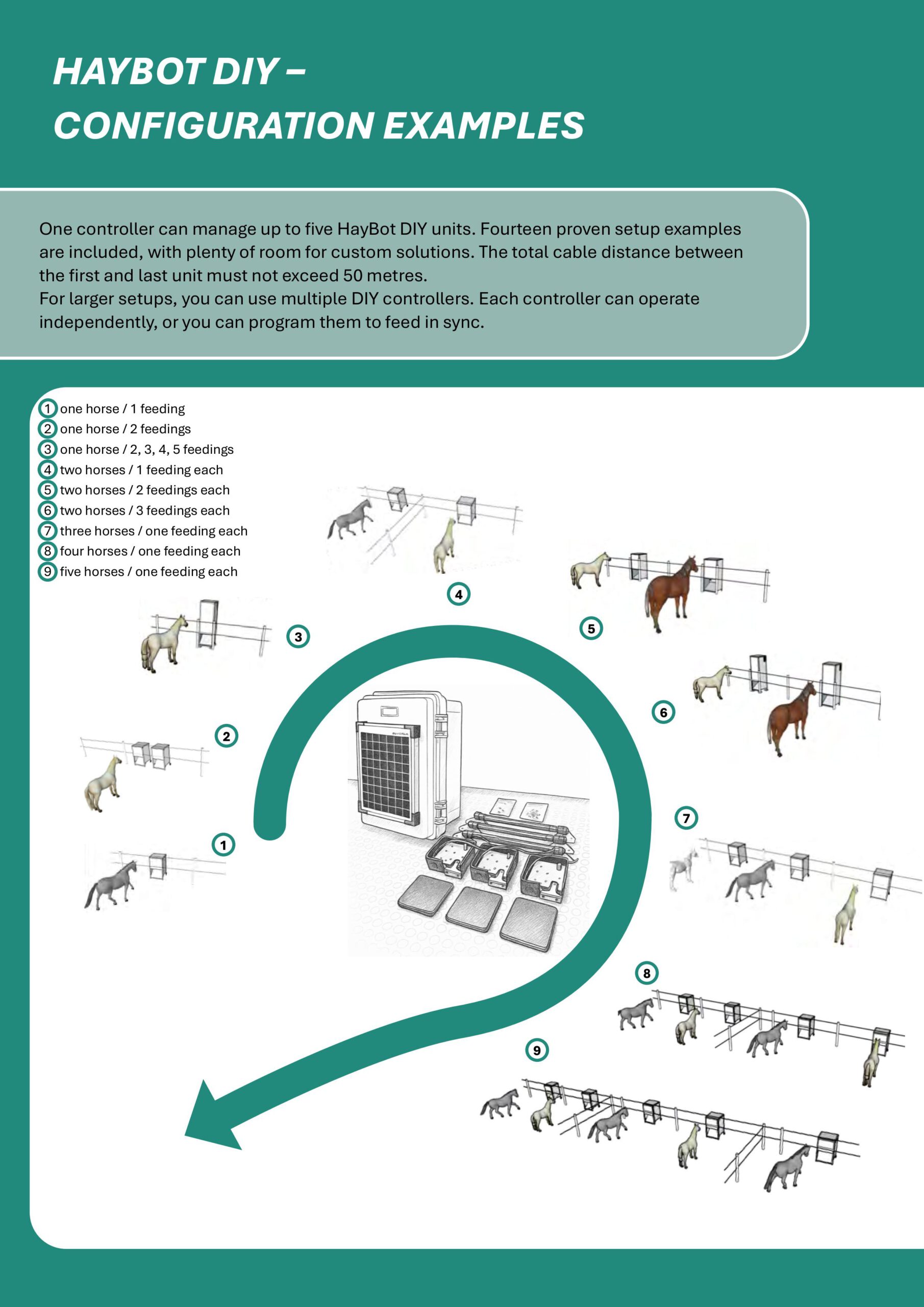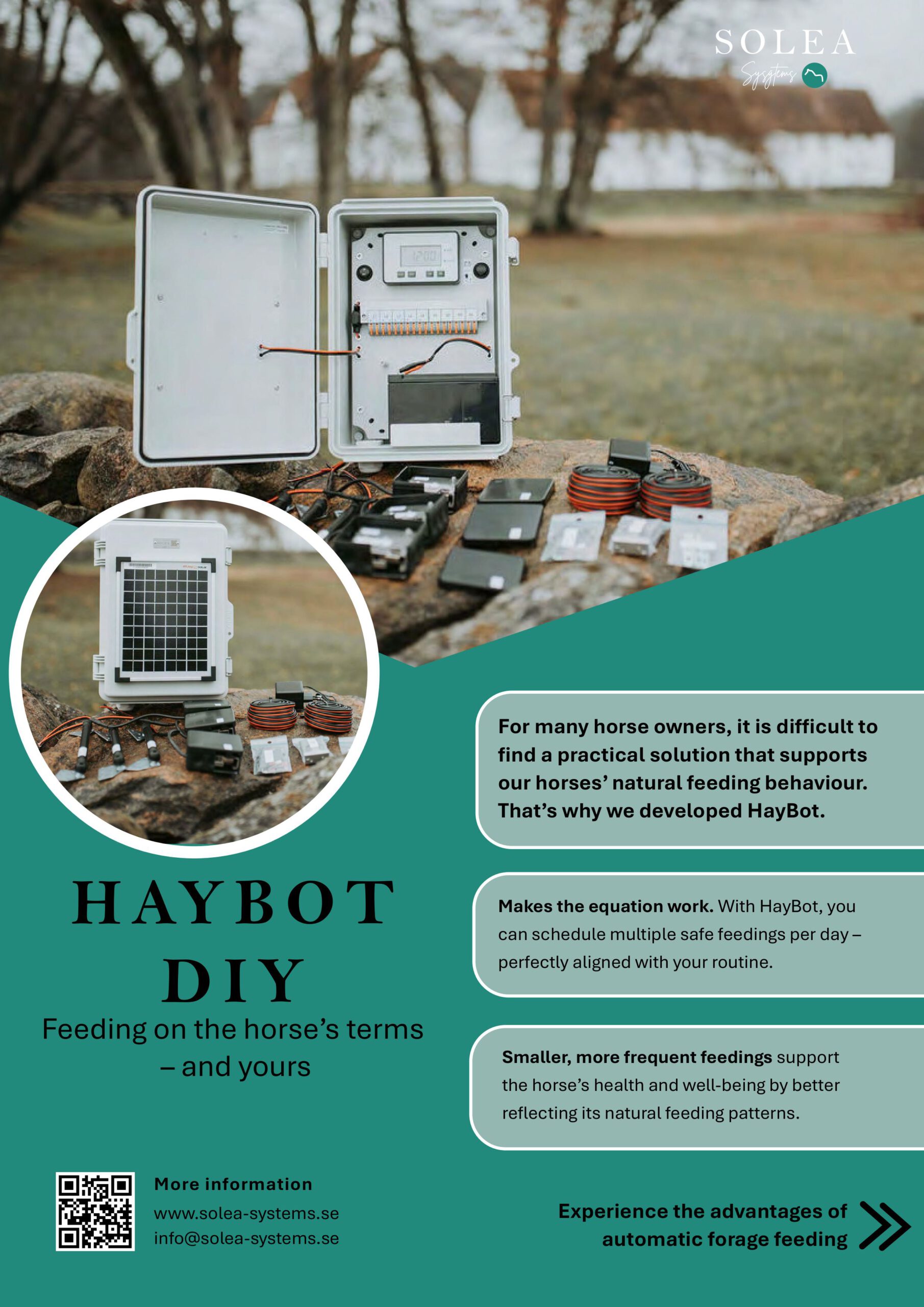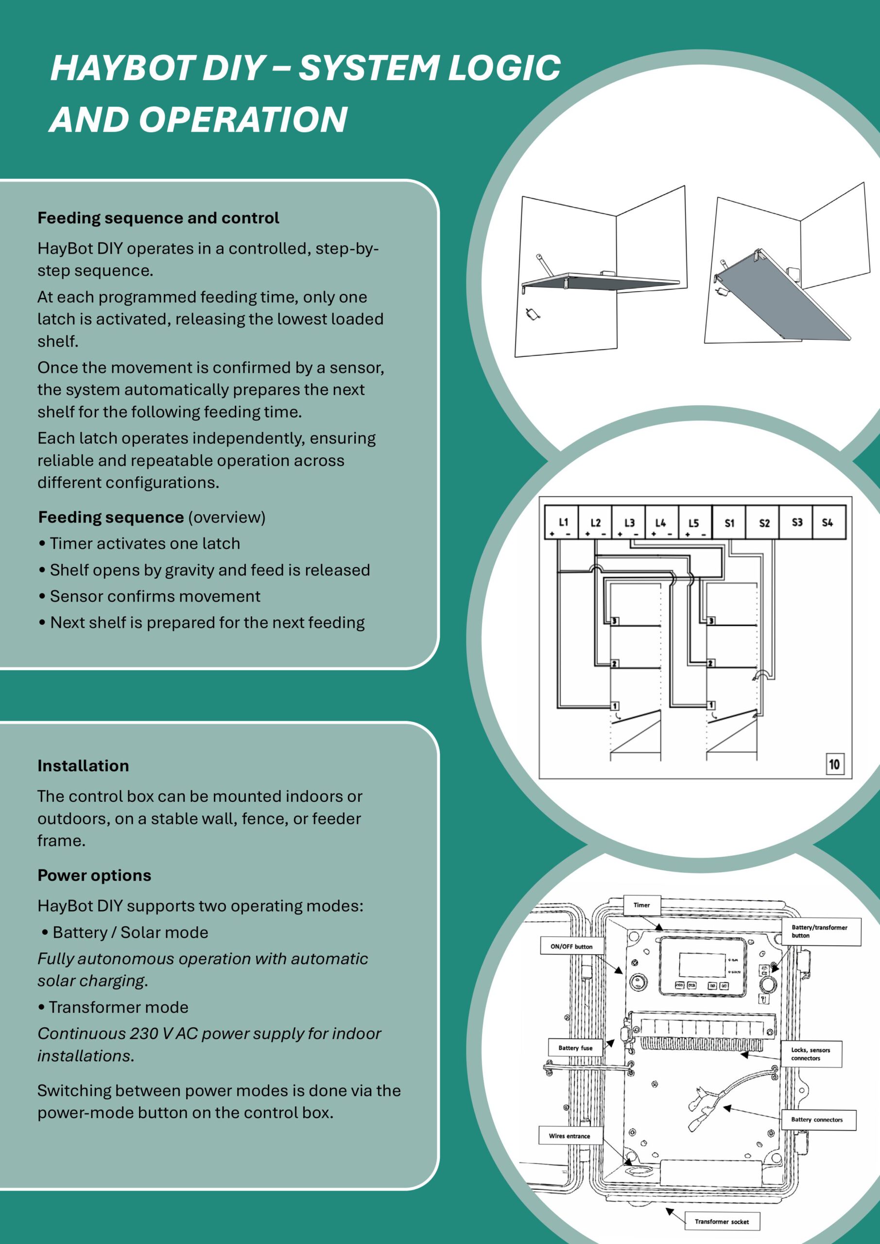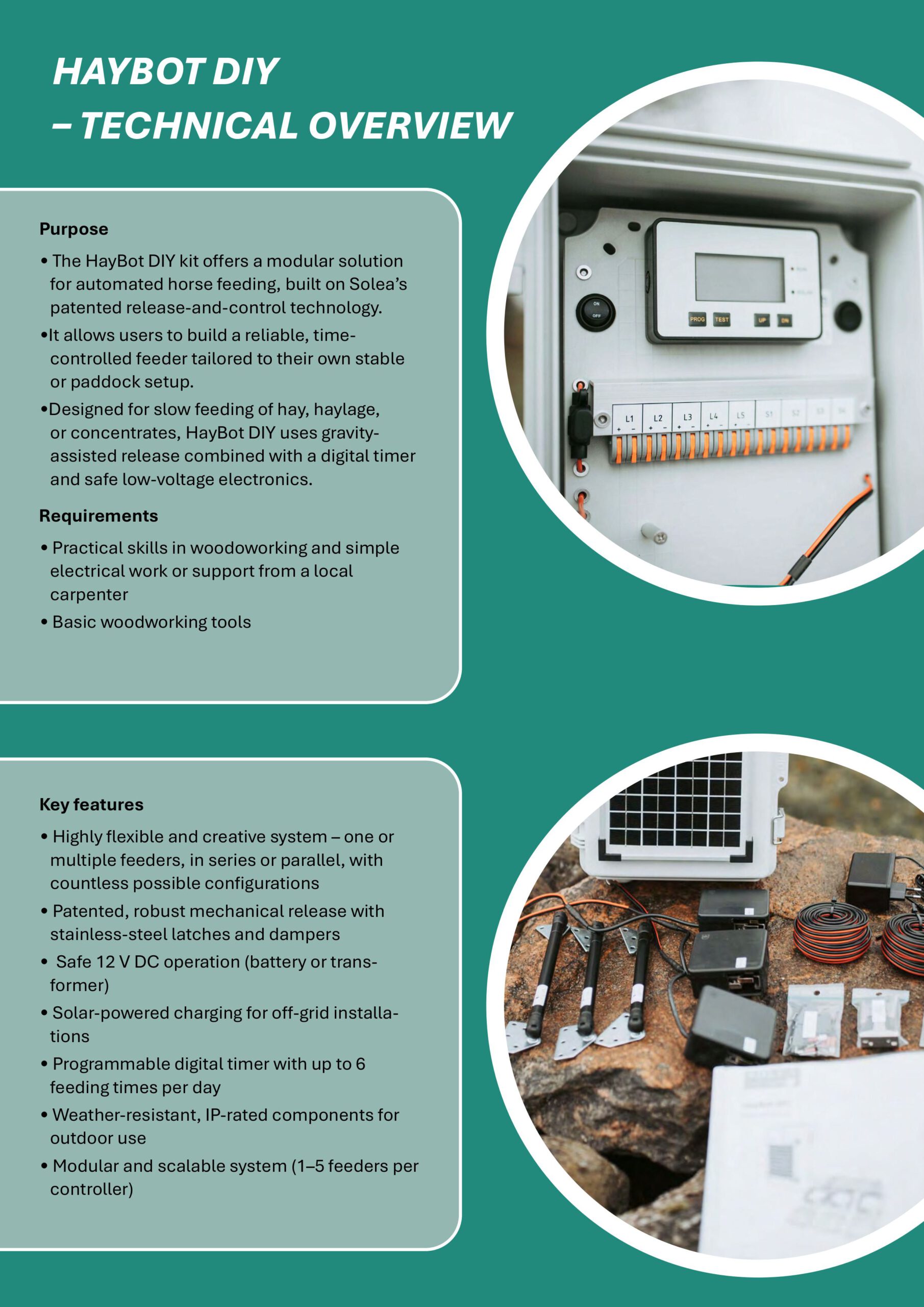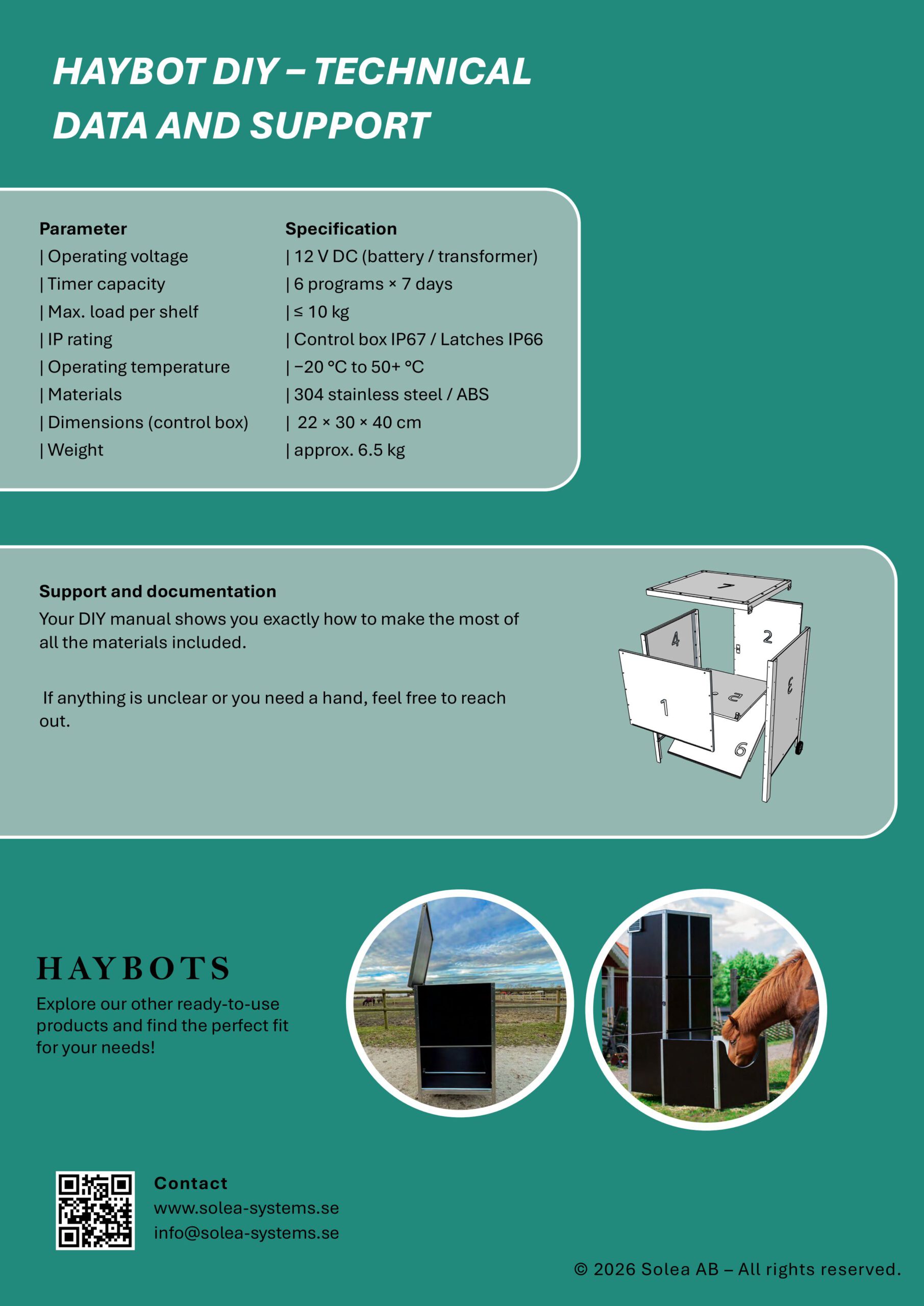 DIY-kit för att bygga en egen automatisk fodringslösning till häst. Paketet innehåller den kompletta automatikmodulen med timer, styrning, sensorer, lås och dämpare samt tydlig monteringsguide. Du bygger själv behållare/låda efter dina behov och kan anpassa systemet till ditt stall. Tekniken är testad i verklig drift och ger en enkel, flexibel och driftsäker automatisk utfodring. Flexibel drift: 12V batteri (med solpanel) eller nätanslutning. Ett DIY-kit kan driva upp till 5 automater.
